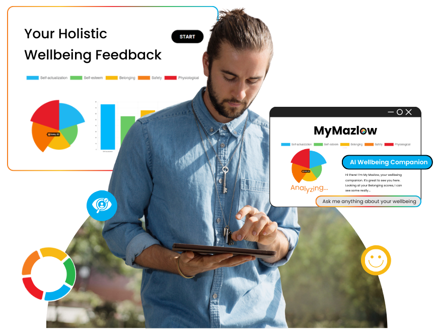 Instantly view your wellbeing mapped across five key domains: Physiological Needs, Safety Needs, Love and Belonging, Esteem, and Self-Actualization — giving you a clear, actionable picture of where you stand.