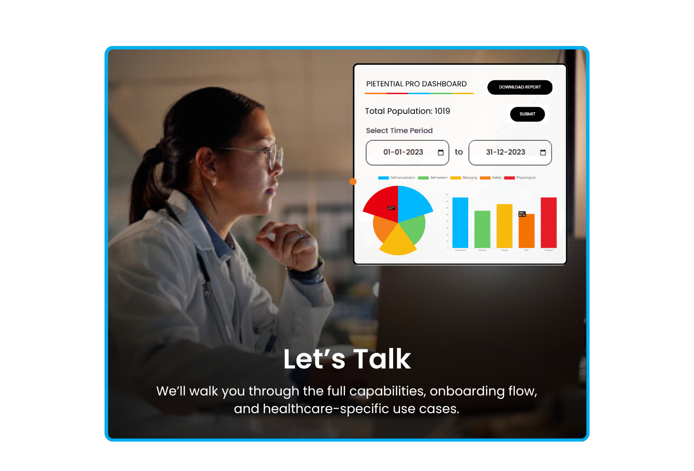 Pietential offers a science-backed, easy-to-deploy solution that brings objective, predictive wellbeing intelligence to hospitals of any size. By integrating Pietential into workforce strategies, leaders can protect their staff, improve patient outcomes, and build a sustainable, resilient care culture.