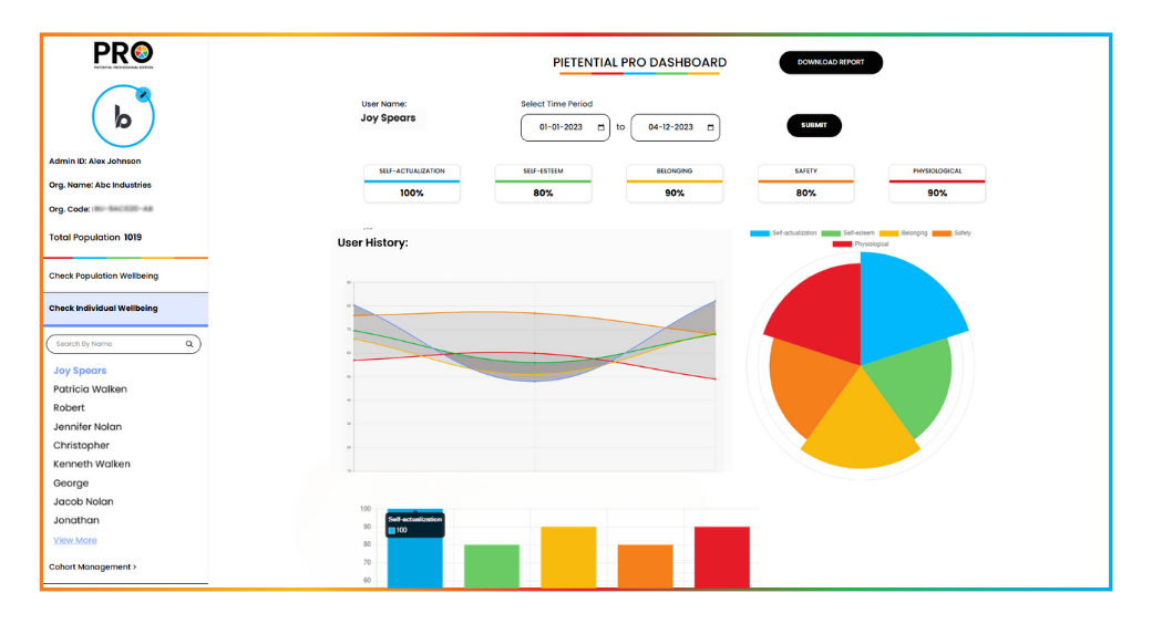 MyMazlow™ is Pietential’s personal wellbeing companion. Based on each individual’s scores across domains and subdomains, it interacts with them in a supportive way — encouraging reflection, prompting self-awareness, and suggesting practical steps to strengthen resilience and balance. (Future releases will allow organizations to link employees directly to relevant internal resources, expected within the next release cycle, 90–120 days.)