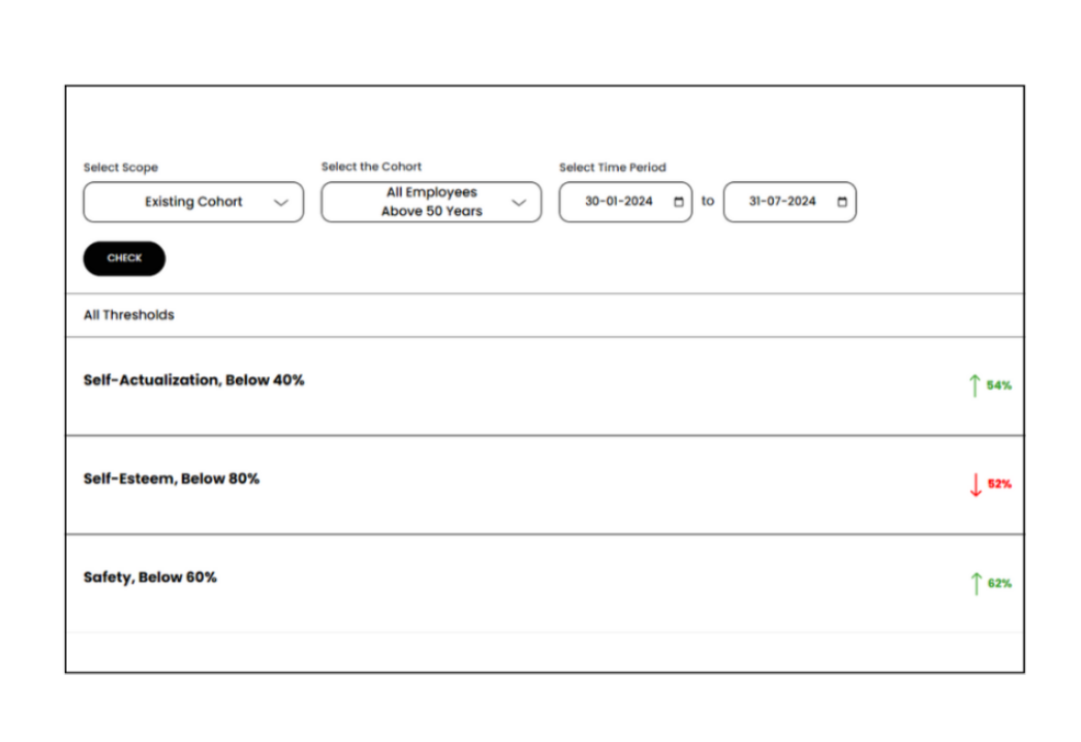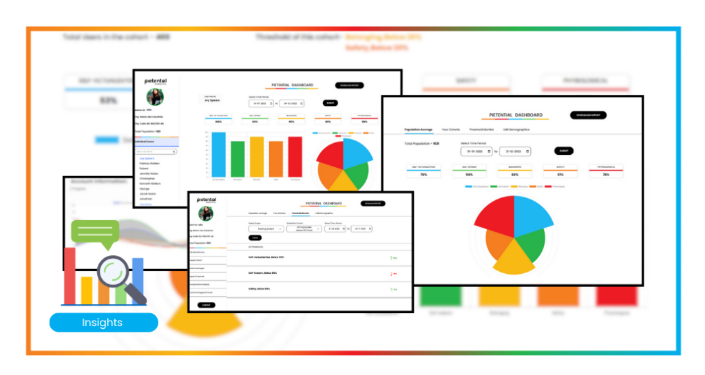 Pietential allows practitioners working with cohorts or larger populations to apply custom demographic filters. These filters make it easy to analyze wellbeing trends by group type, region, age, gender identity, job function, or any other key characteristic, enabling more tailored insights, targeted interventions, and equitable support strategies.