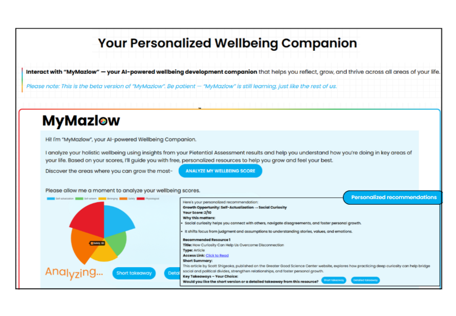 At its core is the Pietential Holistic Wellbeing Index—a validated, reliable, research-backed wellbeing measurement tool grounded in a reimagined  Maslow’s “Hierarchy” of Needs. This framework translates complex human experiences into clear, visually articulated, actionable insights, helping practitioners support personal growth across life domains.