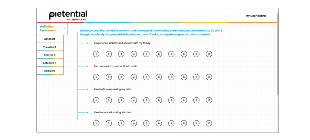 Pietential measures holistic wellbeing using five domains derived from Maslow’s Hierarchy of Needs, reinterpreted to reflect a modern and non-hierarchical approach. These domains are:
